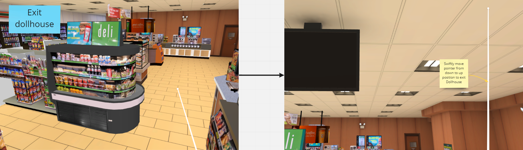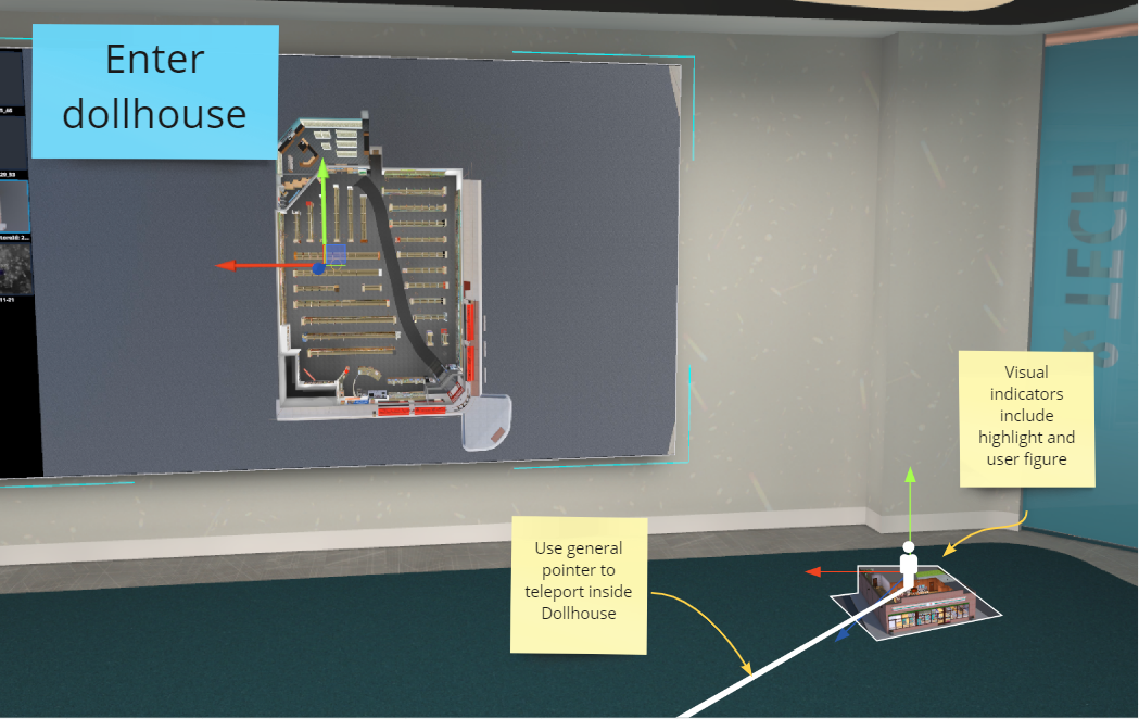 Dollhouses and teleportation aren't new constructs in the VR space, the complexity of this feature was in the technical constraints. For example, engineers had to consider the capabilities of the software as well as the client's hardware — loading multiple, fully 3D-rendered stores, in a single store would reduce the frame rate to a crawl. The compromise was for our 3D artist to create "lighter" versions of stores and require users to import a single store at a time that they plan to use as a dollhouse.