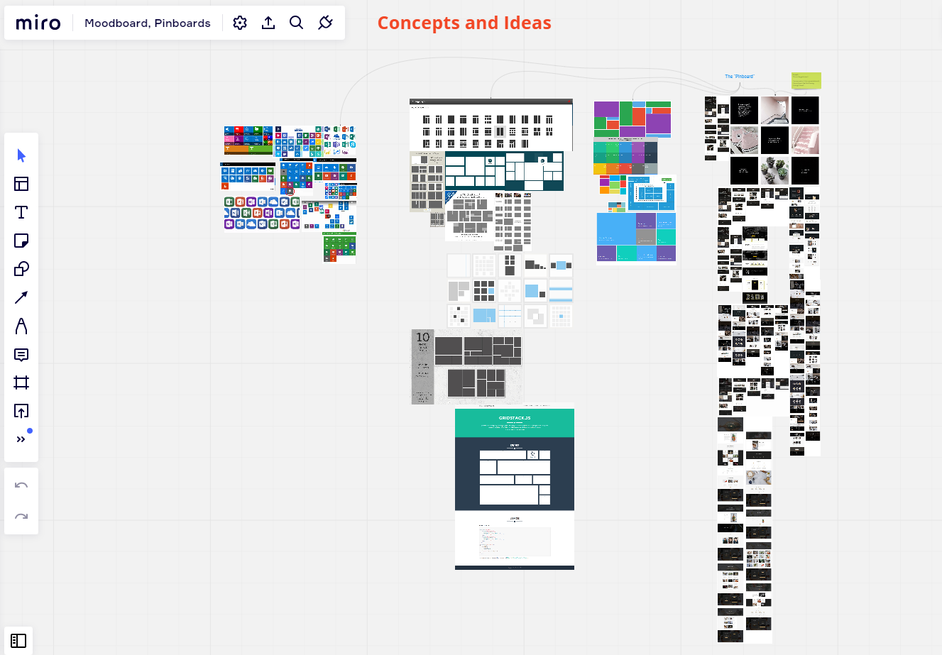 To give the pinboard concept life, we started conducting research to see if it already existed in the world. Like many ideas, you look for inspiration right in front of you. For example, Windows desktop animated a flyout to display apps in a tiled layout, which varied in size. To take the exploration further, we wanted to give users flexibility to adjust the layout based on a desired shape and size. We took inspiration from many places and realized we wanted to build a collage, a "Pinboard." We captured all of our ideas on a Miro board and began discovery.